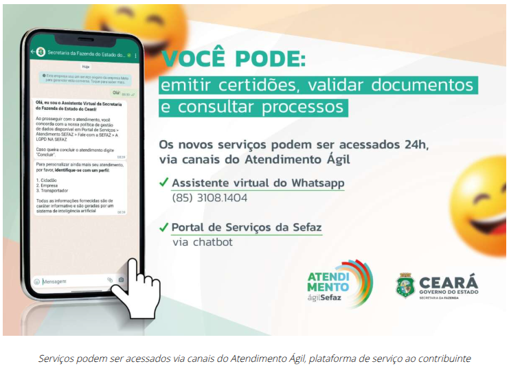 Os serviços podem ser acessados 24h pelo Assistente Virtual do WhatsApp, no número (85) 3108-1404, verificando se ele possui o selo de verificação e está registrado como Secretaria da Fazenda do Estado do Ceará. Também é possível realizar a emissão, a validação e a consulta pelo chatbot, disponível no Portal de Serviços da Sefaz. Em ambos os casos, basta escrever o nome do serviço desejado.